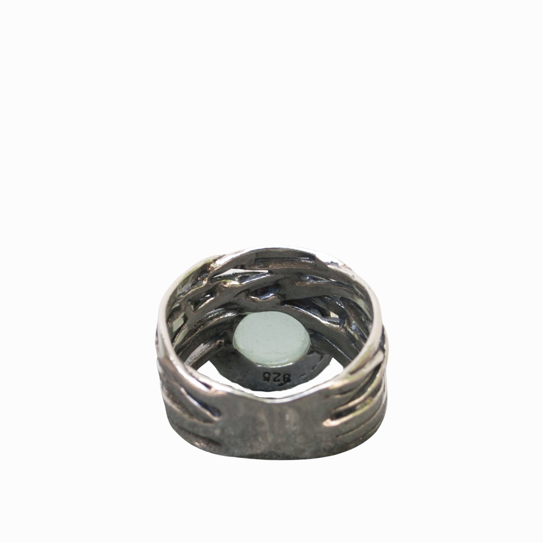 A sterling silver ring with a faceted aqua chalcedony dome on a chunky band, displayed from the back with the .925 stamp of quality shown.