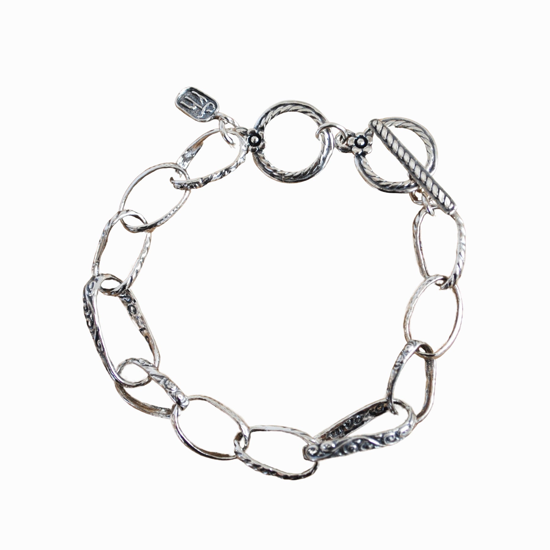 Heavy links of sterling in a variety of textures and sizes are hand cast with the words "love," "hope," and "dream" inside the largest links of this unique bracelet.  Subtly carry this message with you every day! This clever bracelet is handcrafted with an adjustable sterling toggle clasp and measures 7 1/2" to 8 1/2" long.
