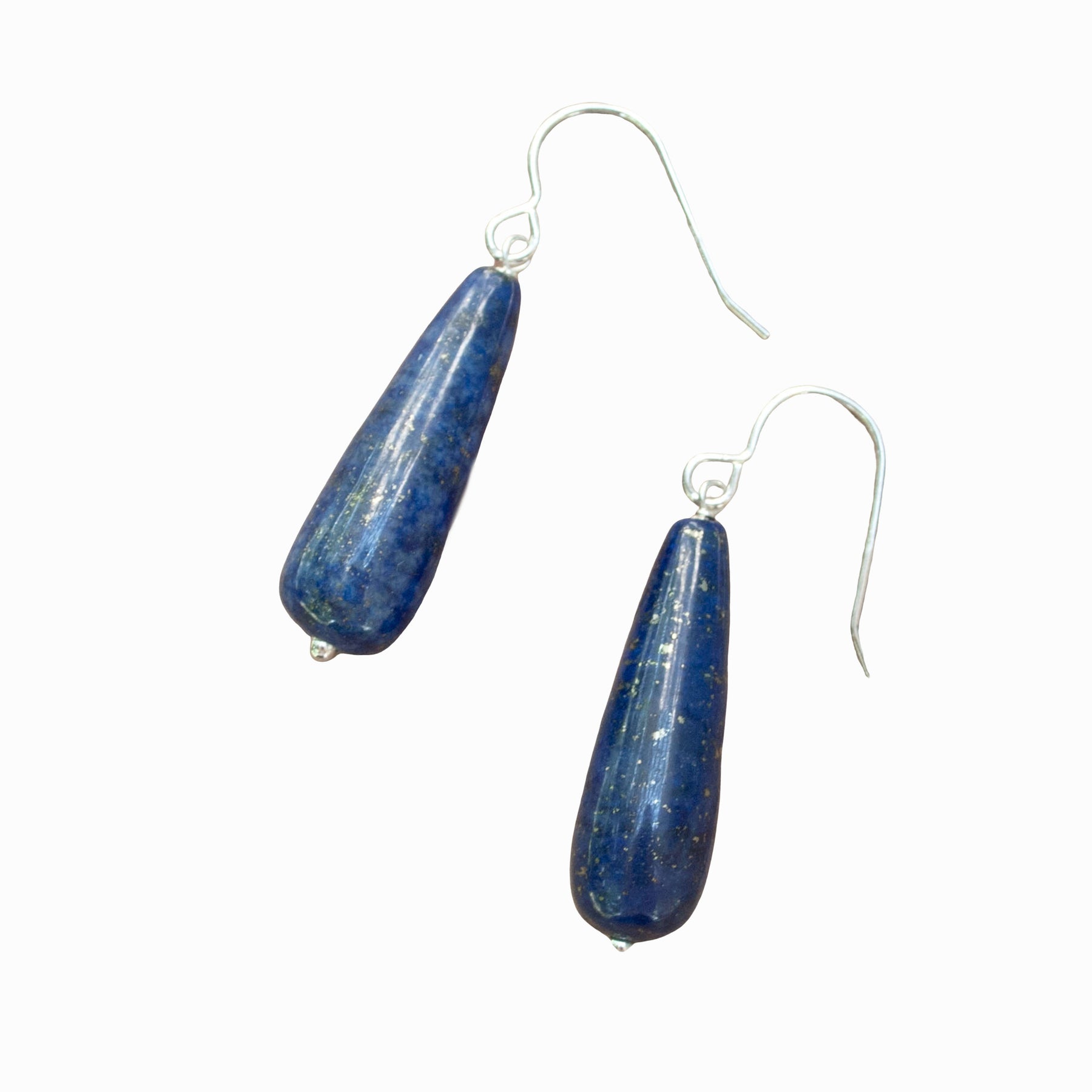 Silver earrings with long lapis teardrops on .925 French earwires, shown on a white background.