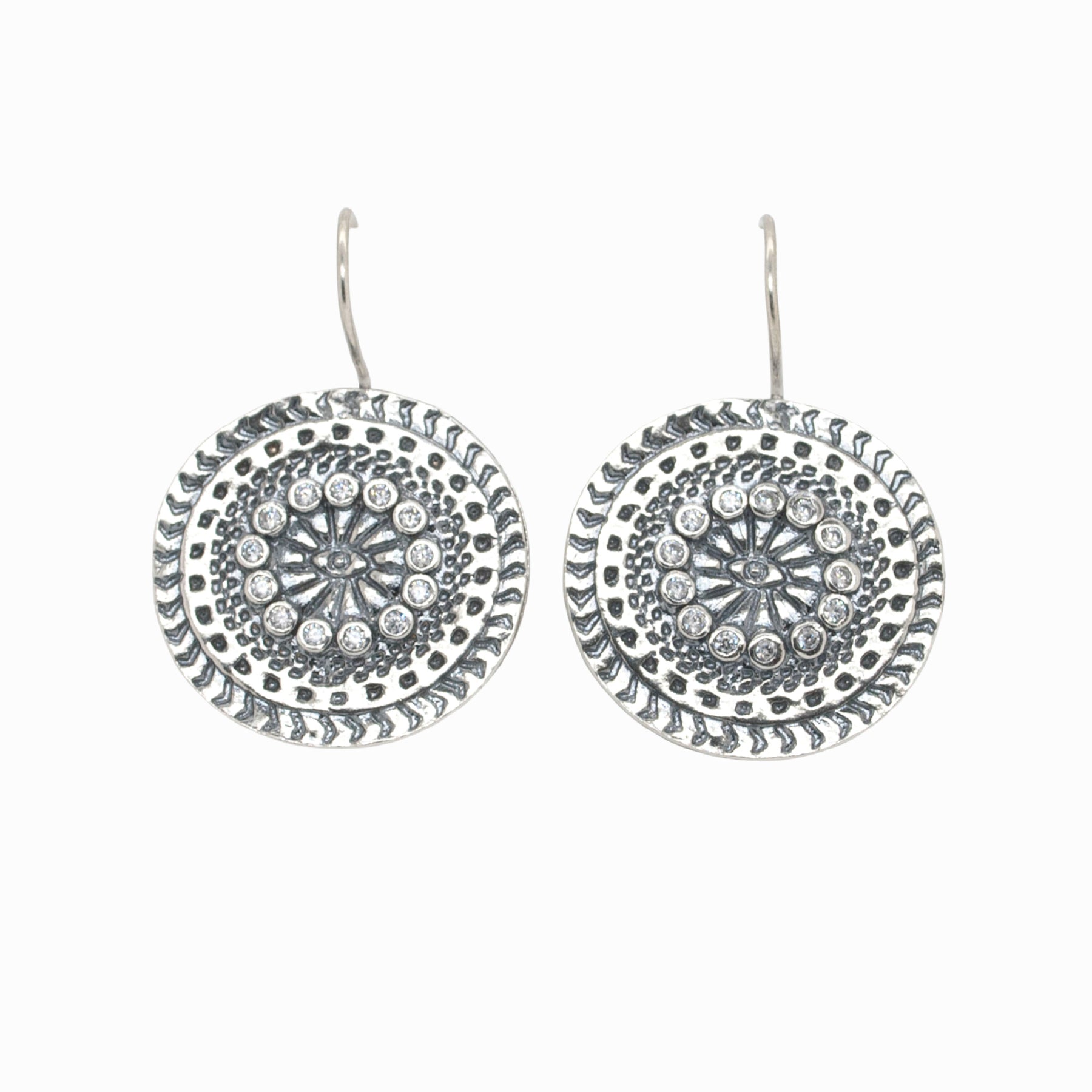 Our mandala earrings, made of sterling silver and CZ, sparkle with a subtle shimmer. They are artisan-crafted with .925 silver and fixed to French ear wires. They are a RockHill exclusive and approximately 1 1/4" long.